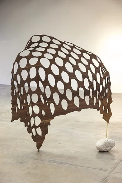 Particularly intriguing is a trio of walnut wooden sculptures, whose perforations mimic those of the curtain. These Walnut screen sculptures individually maintain a strong presence in the space, despite their distance from one another, and are enigmatic in their illusion of substance. The sculptures are self reliant and rooted in balance, standing upright on their own accord, with a little help.The weight is equally distributed between its leg on one end, and a foundation of brass and stone on the other. While their formal aesthetic airs to a certain gravitas, there is a vulnerability in their perforation that serves a metaphor to the human condition. This is why I found the process fascinating. Smith created these sculptures by cutting holes into fabric, draping it on a previous sculpture entitled dummy, photographed the way it lay, and remade the work as a sculptural object. Smith states, “I like the idea of them going through a series of filters but still communicating the original form.” Same idea, different material, making and remaking. The process is just as metaphorical as the object itself.