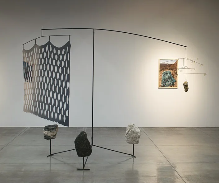 This idea carries over to a larger, more complex sculpture entitled Prussian blue and the soft satellite. In order to achieve this form, cut fabric was pinned to Smith’s studio wall, photographed and re-made into a plastic replica. When thinking about fabric, the words softness, weight, and malleability come to mind. It is slightly unnerving to see softness become a calcified version of itself. Like a fossil, Smith’s recreations play with preserving something existing a certain way in a moment of time. This way of record keeping is a strong nod to the possibilities of material. In the sculpture, the plastic screen balances on one side of a steel mobile, while the other balances a mobile of bells and a rock wrapped in wire. Three larger rocks are the weight and foundation in this piece, continuing the idea of resting on the solid and strong. According to Smith, the bells are a nod to the sacred, representing stillness, peace, and silence. The nuanced materials used in this piece dazzles visually while sparking our mental curiosity at the same time. Subtle moments occur in the work that resonate, for instance a moment where a rock is placed as such, that it reflects into the perforated plastic. The rock’s reflection becomes a skewed abstract version of itself, despite being a solid object in reality. This again nods itself back to Smith’s search for truth in making.