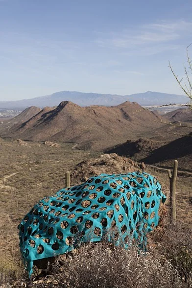In addition to sculpture, a suite of Smith’s landscape photographs entitled my back to my mind's eye line the periphery of the gallery walls. Taken in the Sonoran Desert, each photo captures the landscape and teal cut fabric, a clear foreign object for the setting. Smith drapes the fabric over the landscape, and it morphs into something sculptural and almost human as it takes on the rocky terrain. The pop of color the fabric provides adds a nice contemporary flare to the show, brightening it up in sea of deep hues in the curtain and sculpture.