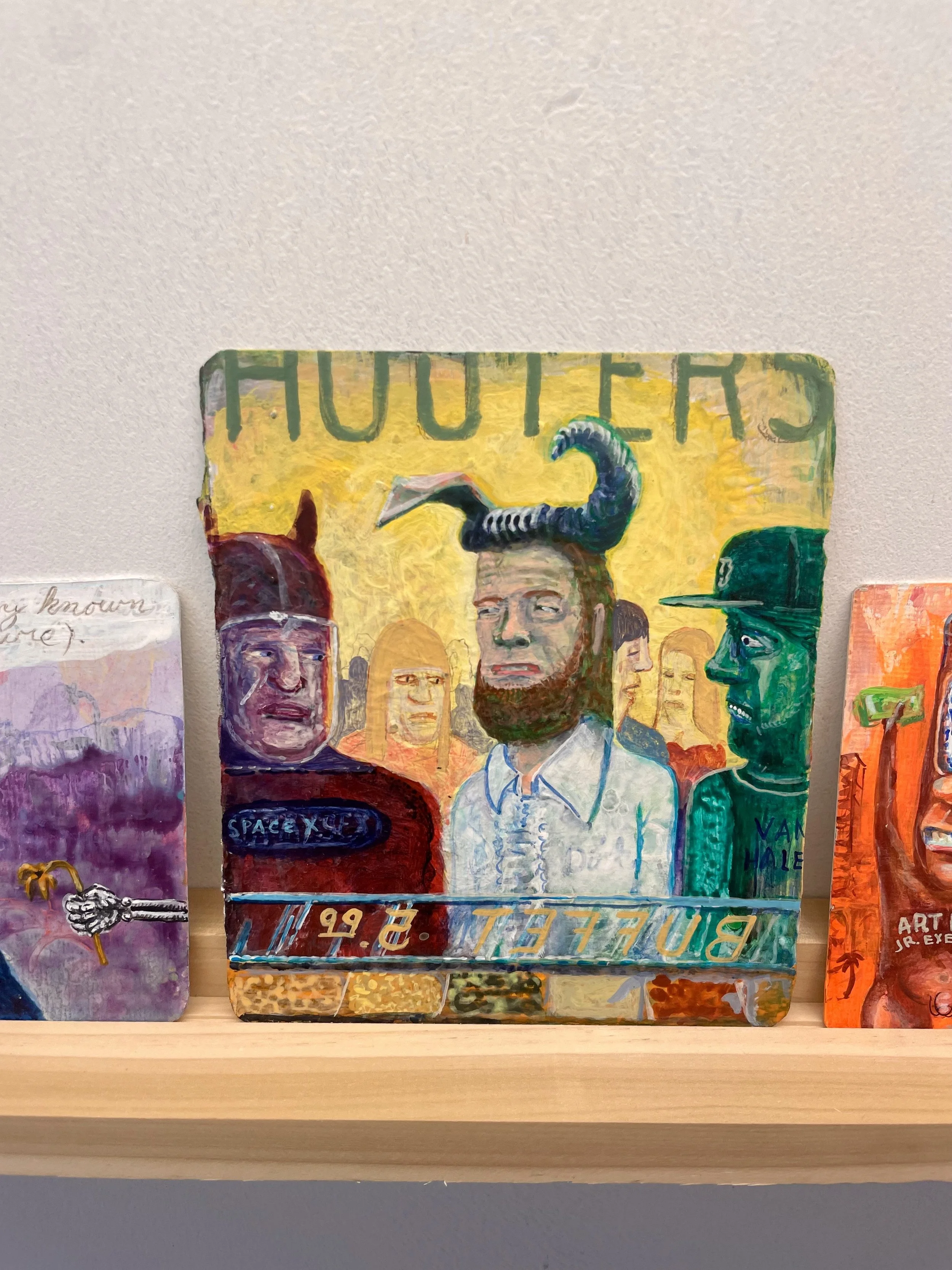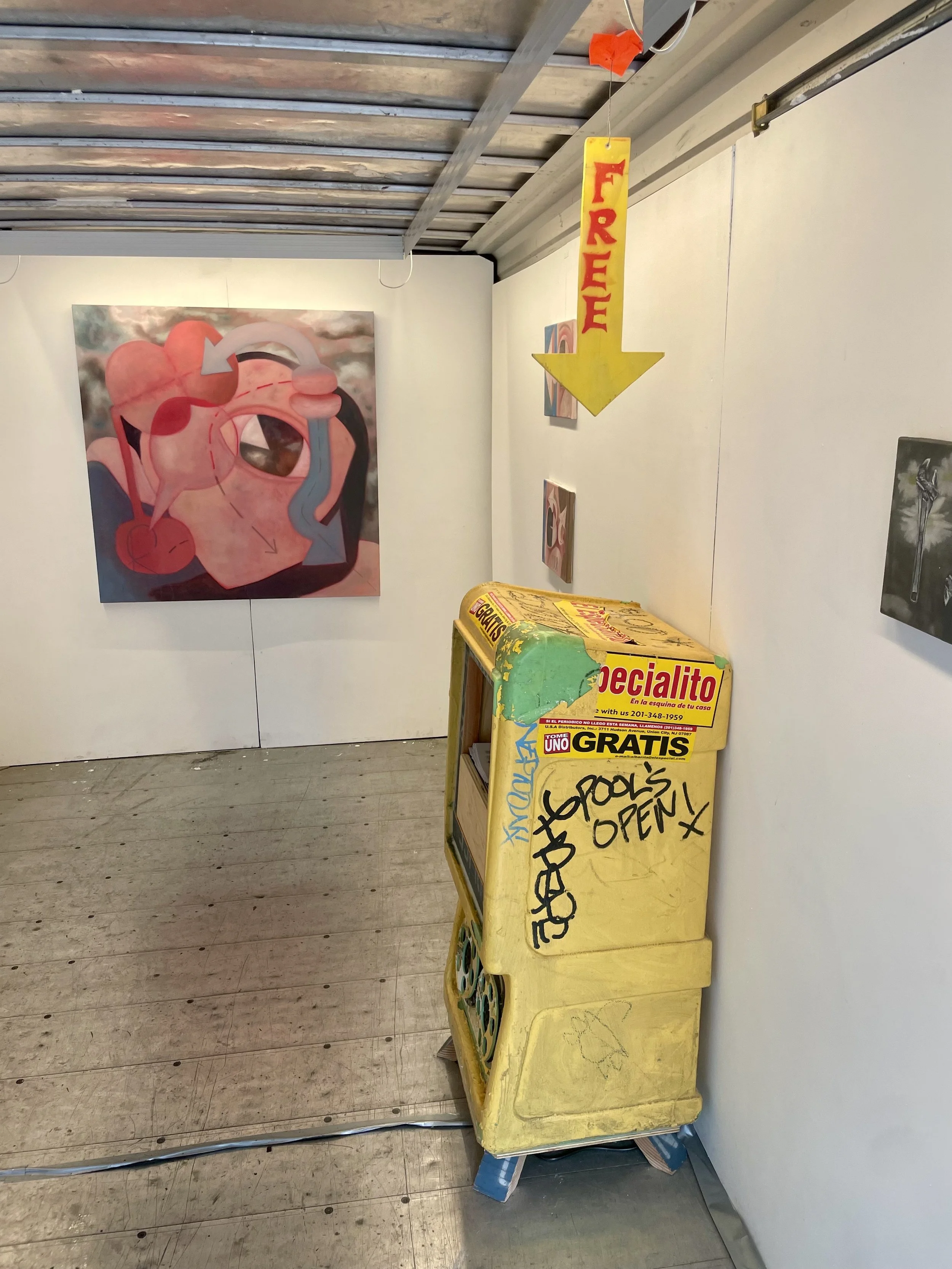 A lowbrow aesthetic evocative of the Mission School of the 90s abounded - a nostalgia that feels less and less nostalgic in our economic and political climate. This was perhaps most pointedly demonstrated in two projects: Bruce Tapola and Melba Price’s Post Times and the Brooklyn based artist collective Quantum Academy. In Post Times, Tapola and Price collaborated to create diminutive paintings then presented them clustered together on a shelf running the interior of their truck, creating a kaleidoscope of small videttes that visitors could buy for $250 each. Across the street, Quantum Academy created an interactive installation, including wooden constructed speakers playing music on either side of the truck entrance, a clothing bin of thrifted and then silk-screened t-shirts for sale and a weathered newsstand re-appropriated to hold a newspaper created by the collective—all of which felt like a youthful play with the visual culture of urban living.