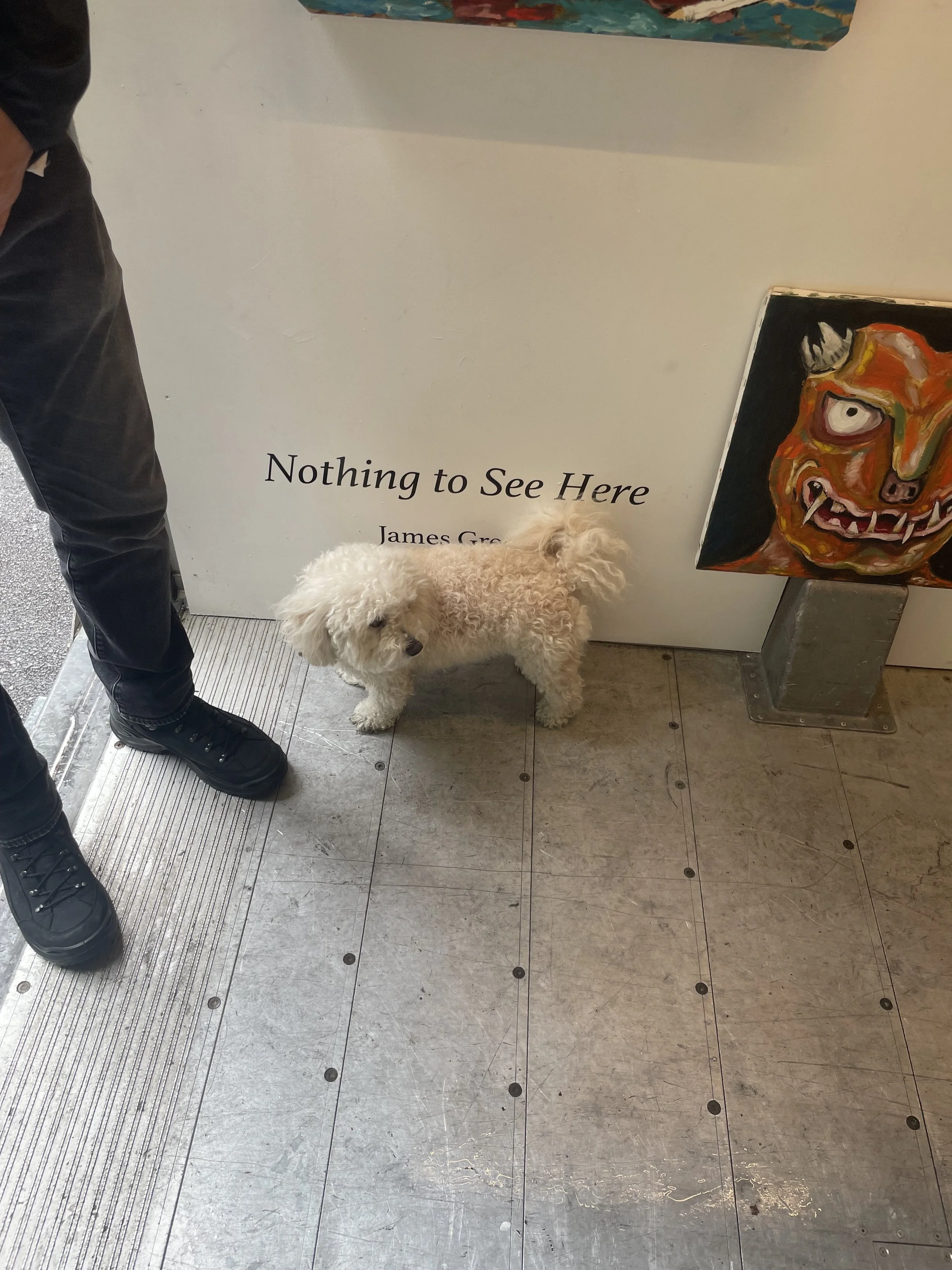 Many of the works celebrated a tongue and cheek sensibility, including Mey Gallery’s Lynch-inspired exhibition Mulholland Drive! Mulholland, Drive!, Indiana Hoovers and Stowaway’s show of decadent paintings We Sell Bananas, and Lucy Black’s Landline--a plush cartoonishly suspended telephone receiver. Last Days Gallery featured Nothing to See Here a solo exhibition by artist James Greco, a body of work that combines psychedelia with bold confident brush strokes (The space also included his studio companion a little white dog named Basil.)