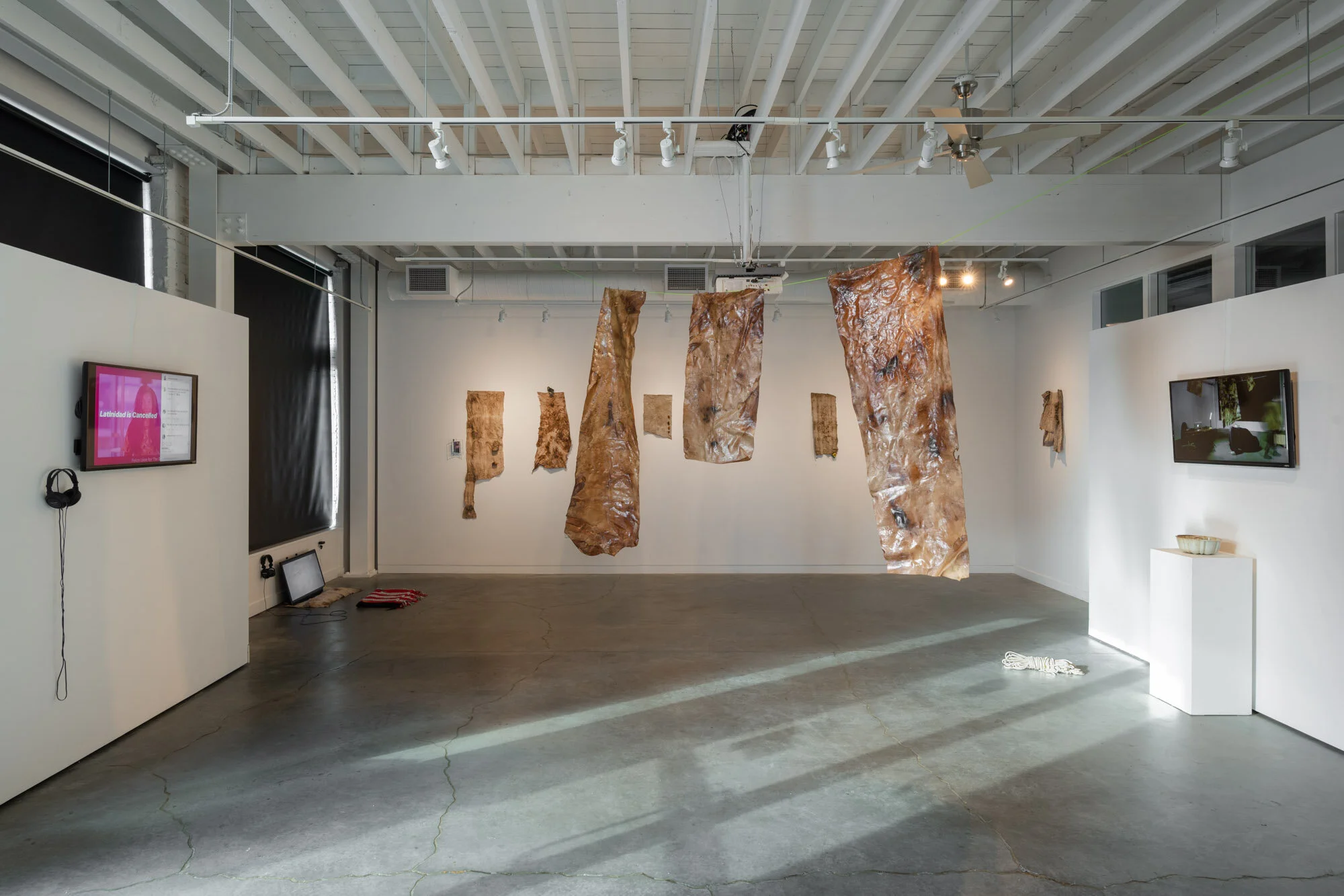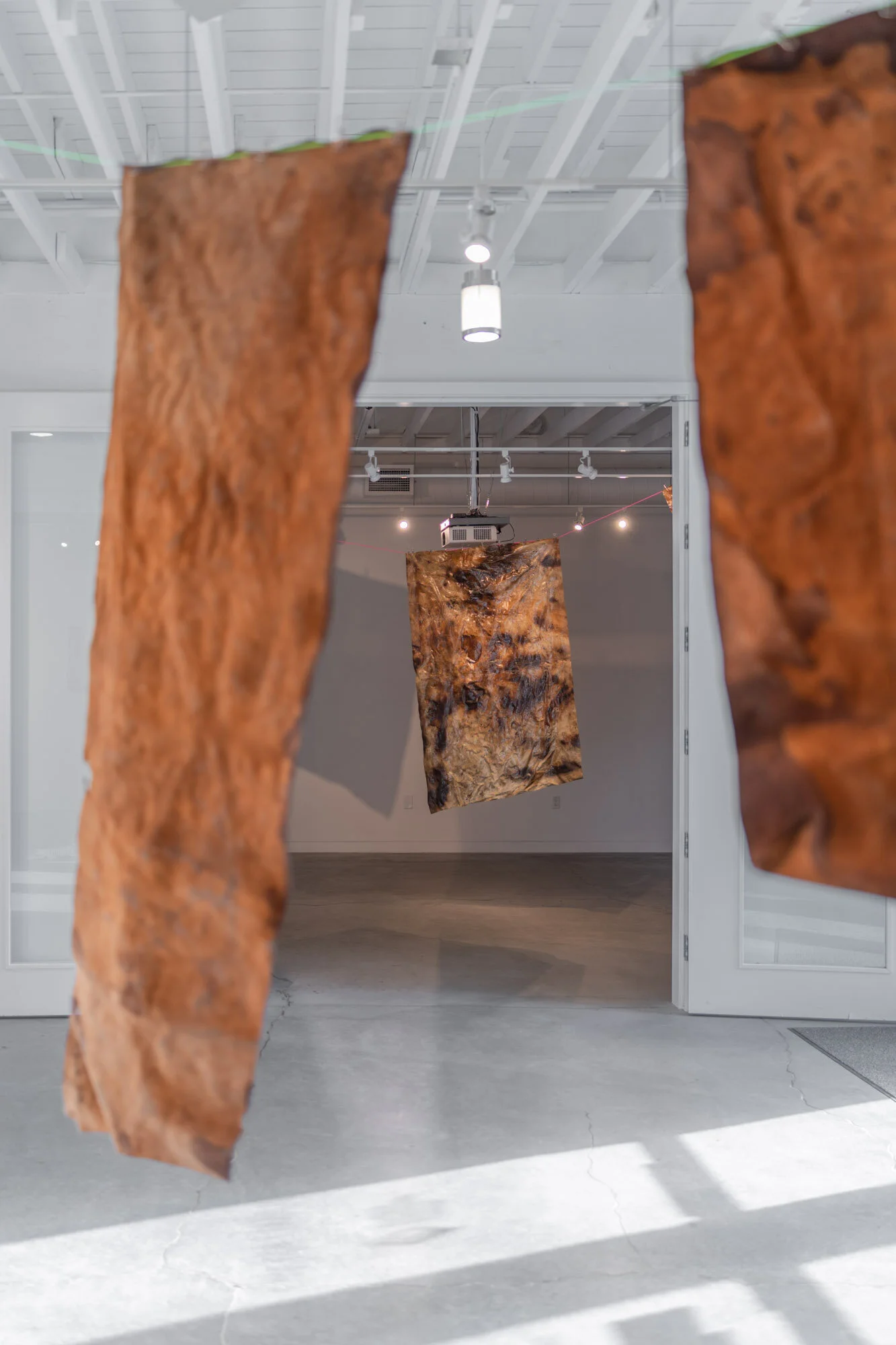 Background: Rindon Johnson, I don’t think your prayers get over your head. No I see nothing. Heal me. To set, to put. Adults always be asking for hands. What one has to do: flowers on the table or other ordinary business. Between sport and lace is a finger. You don’t usually find a soft voice on the side of the road, I’m sorry for my little out burst. I think any of these guys are interchangeable, I think you need to eat a rabbit and then you’ll understand. The shine creates a gap. He heaps me. I’m in over my head. I’m in over my head. I’m in over my head., 2019. Hide, Vaseline, dirt, gravel, dust, shellac, rope, aluminum clips, dimensions variable; Foreground: Rindon Johnson, A trouble in them, 2s019. Hide, Vaseline, dirt, gravel, dust, shellac, rope, aluminum clips, dimensions variable